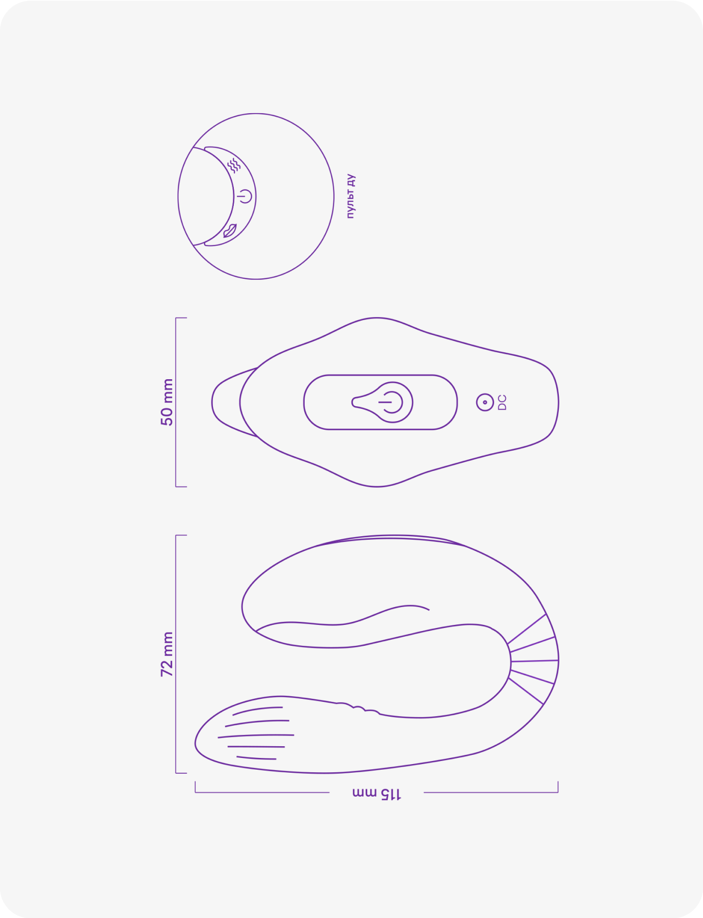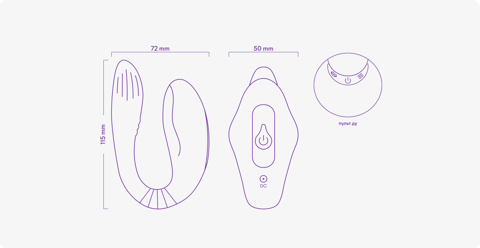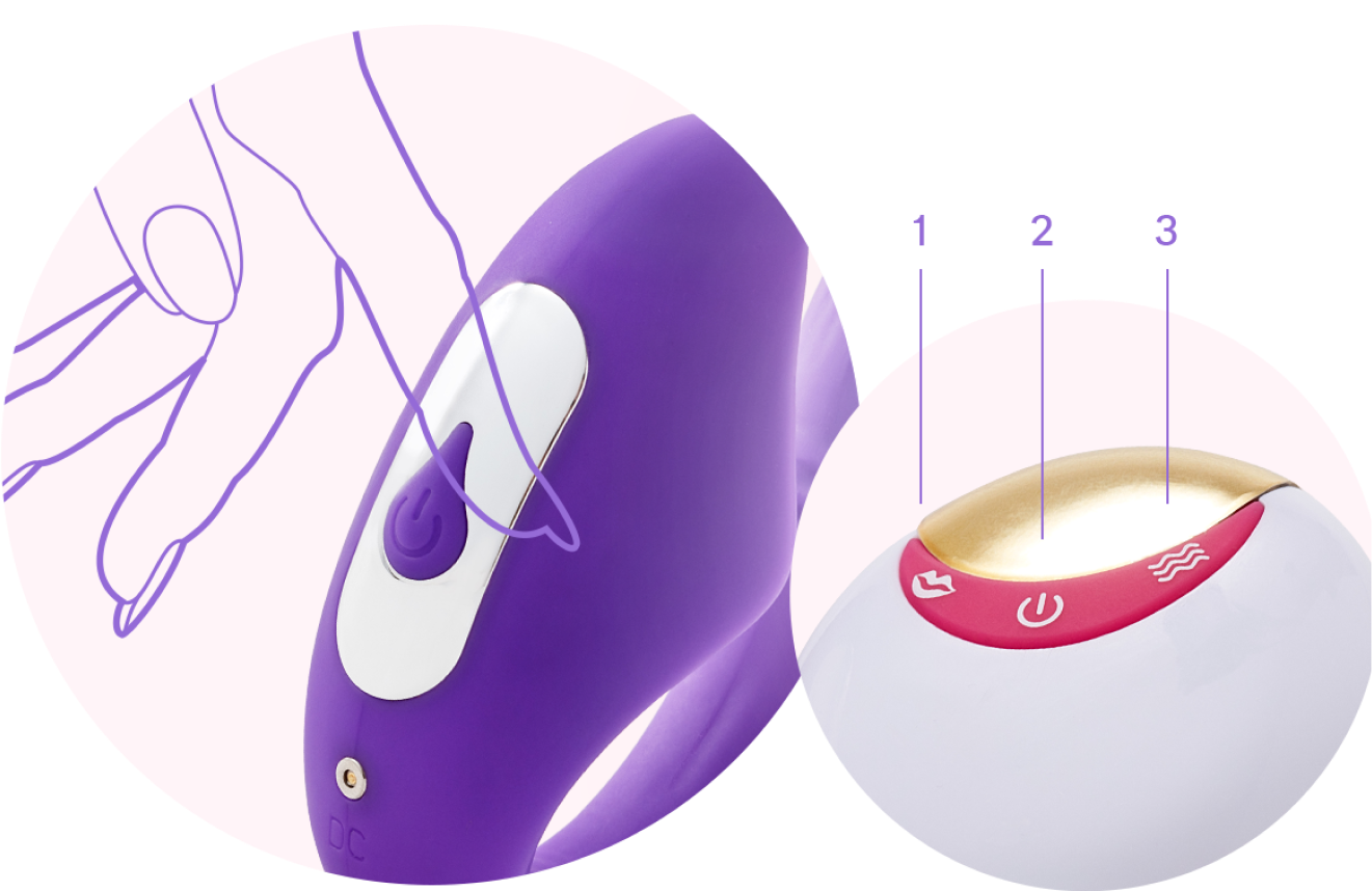 Кнопка слева ➀ позволит включить и выбрать наиболее желанный из 5 режимов вакуумной стимуляции. Для выключения удерживайте кнопку 2−3 секунды.
